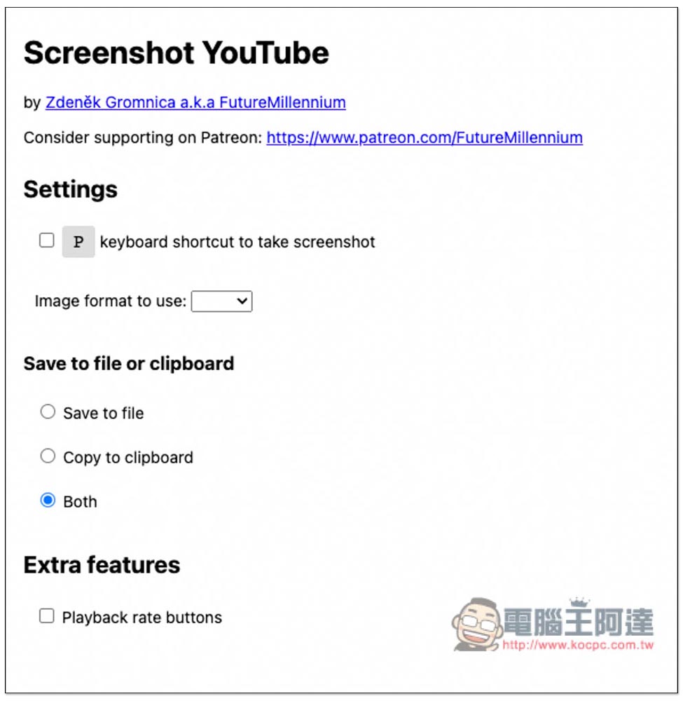 就會打開選項設置,這款支援快捷鍵,不過預設沒打開,有需要的人請把 keyboard shortcut to take screenshot 選項打勾,接著就能使用 P 快捷鍵來截圖。Save to file or clipboard 部分預設會自動下載到電腦 + 複製到剪貼簿,如果你不需要複製到剪貼簿,可以改成下載就好(Save to file):