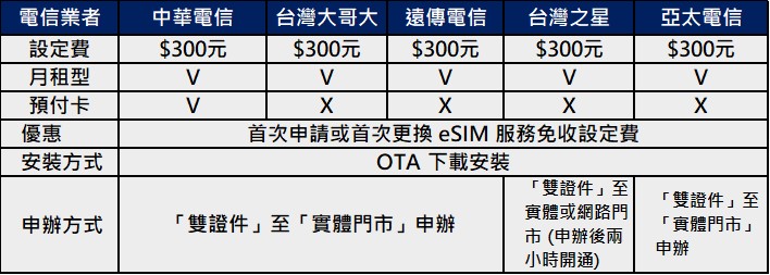 不過,不管eSIM或是未來的iSIM,都有助於用戶更換電信業者,所以大多數電信業者並非樂意推廣eSIM。凡手機送修、換手機、手機重置..等等導致需移除原eSim方案須重新下載eSIM,台灣電信業者都要在收取$300 eSIM設定費。
