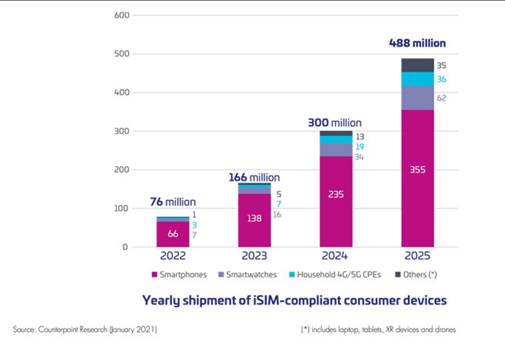 根據 Counterpoint Research 預估,到 2025 年,全球將近 50 億的消費電子產品將支持 iSIM,主要運用的產品為智慧手機、智慧手錶及物聯網CPE(客戶端設備)。由於Apple iPhone與Google PIXEL手機率先帶動使用eSIM風氣,截至 2021 年 6 月,全球已有100多個國家/地區近 400 家電信商推出 eSIM 服務,只要Apple 新款iPhone願意使用iSim技術,iSim取代目前的eSim並不困難。