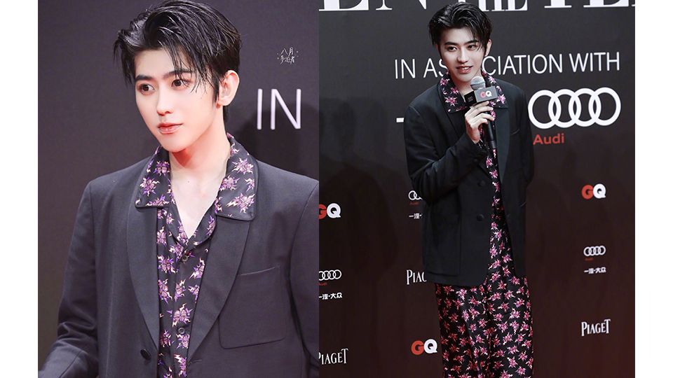 當紅人氣小鮮肉蔡徐坤當晚還是表演嘉賓,紅毯上就屬他最高調,成套的絲質印花睡衣搭配西裝外套,這樣的混搭在他身上還滿合理的。