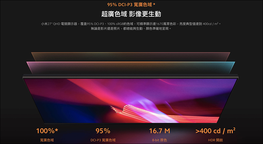 Xiaomi 27 型 2K 電競螢幕配備 95% DCI-P3 、 100% sRGB 廣色域,能精準顯示 1,670 萬色,亮度典型值達到 400cd/ m²(開啟 HDR),讓色彩更生動、顏色也更準確。