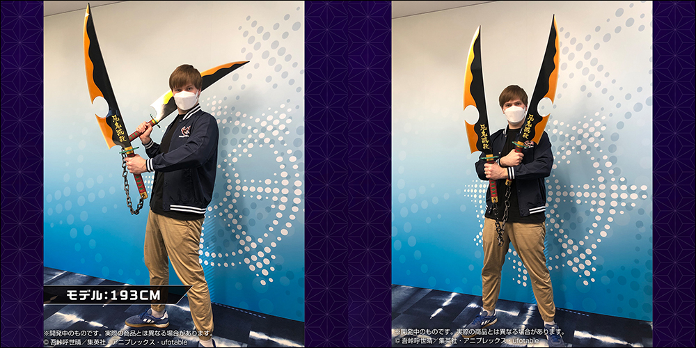 或許是擔心大家不知道這把日輪刀有多大,官方人員也親自示範了手握它的比例,同時也分享模特兒的身高方便粉絲能想像一下產品的大小究竟多大。