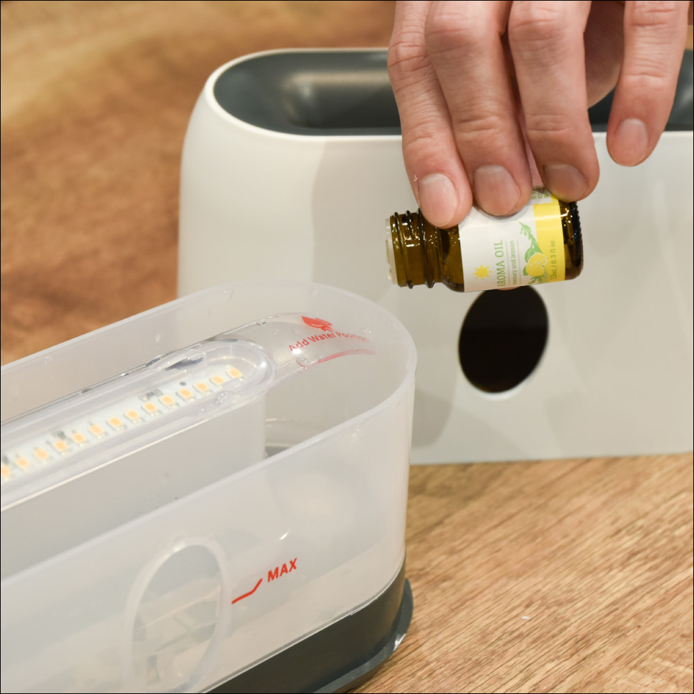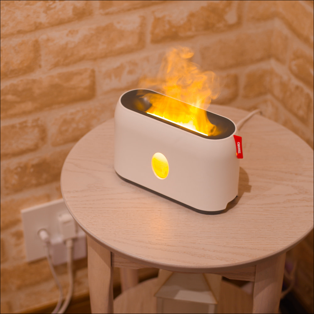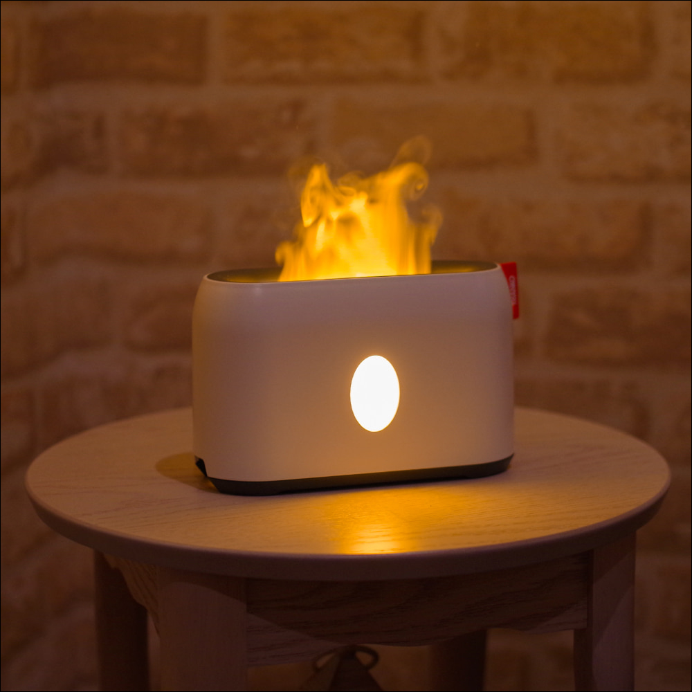 透過機身內一排的 LED 燈,讓原先透明無色的水霧呈現出接近火焰的效果。從「視覺」上溫暖屋內氣氛的同時,也能平衡一下室內的濕度以及讓環境充滿淡淡的香氣(如果有添加香氛精油)。