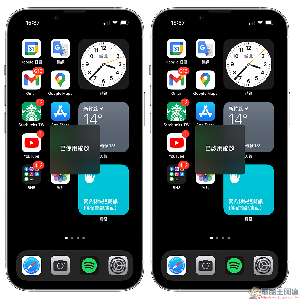 若要開啟或停用「縮放」功能只需連續點擊電源鍵 3 下,此時畫面會顯示當前縮放功能的狀態。像是開啟時,畫面會跳出「已啟用縮放」,反之再次連續點擊電源鍵 3 下則會顯示「已停用縮放」。