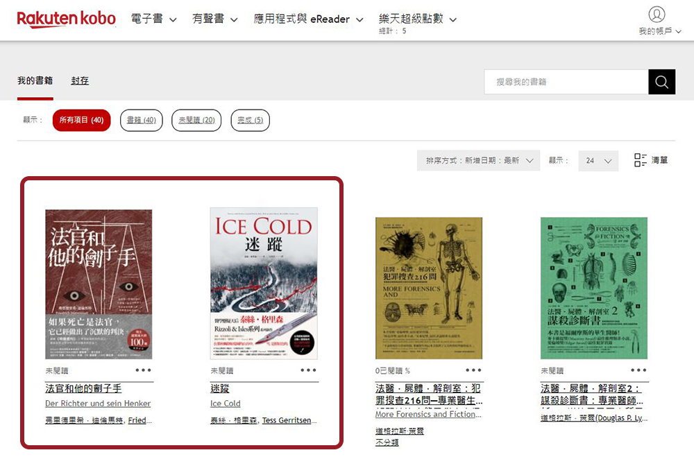 - 接著你就可以在個人 Kobo 書庫中看到剛剛在 PChome 24h 購物書店入手的新書躺在裡面。