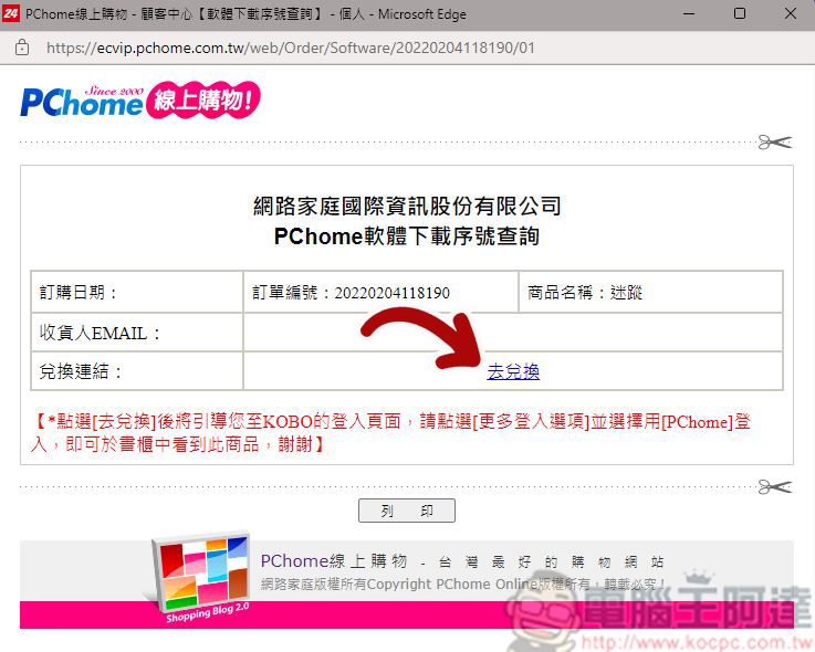 - 點選「內容」,彈出視窗中點擊「去兌換」,接著系統將會引導你到 Kobo 的登入頁面進行下一個步驟。