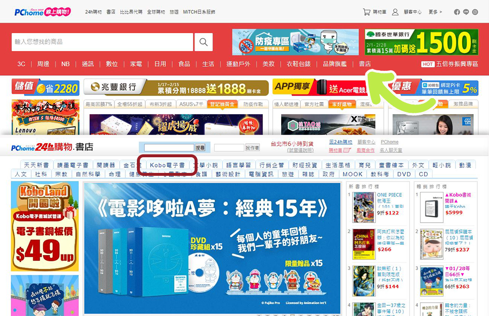 在 PChome 24h 購物書店入手 Kobo 電子書非常簡單,首先在官網首頁上面就能看到「書店」館的入口,點選後可以在上面找到「Kobo 電子書」的分類頁籤。