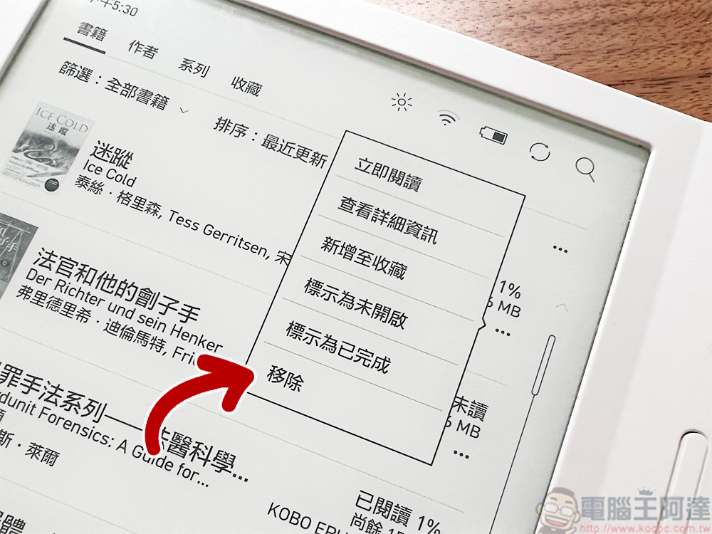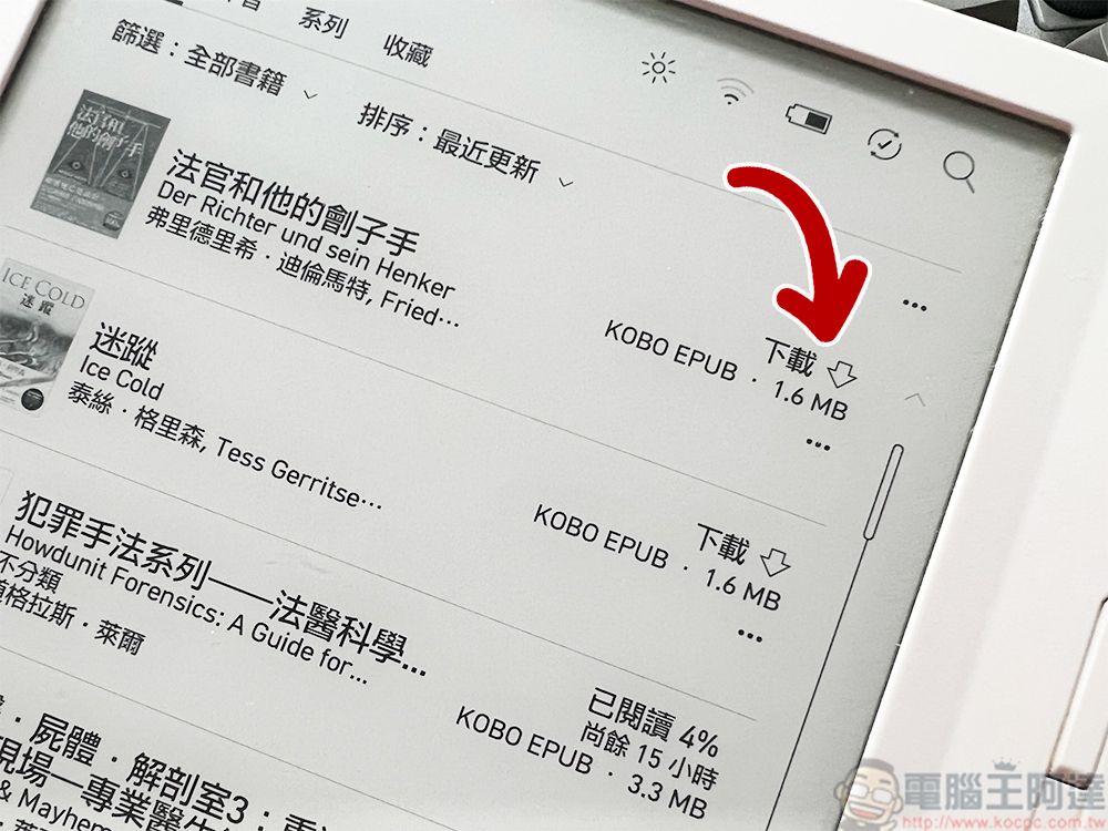 Kobo 系統裡面有一點筆者覺得很棒,那就是為了不佔用你寶貴的儲存容量,預設在「我的書籍」中顯示的是書名與封面,當你想要閱讀該本書籍時,再點選後面的下載圖示,即可將書本內容載到你的電子書閱讀器中。