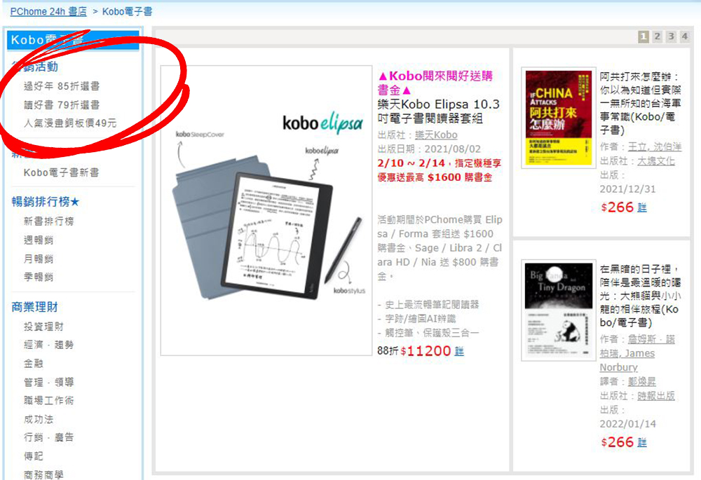 - PChome 24h 書店加碼抽,指定產品消費滿 599 登記就抽 Kobo Elipsa 閱讀器 (價值 12,800 元)