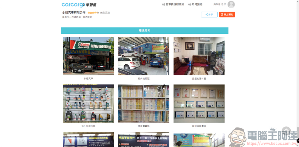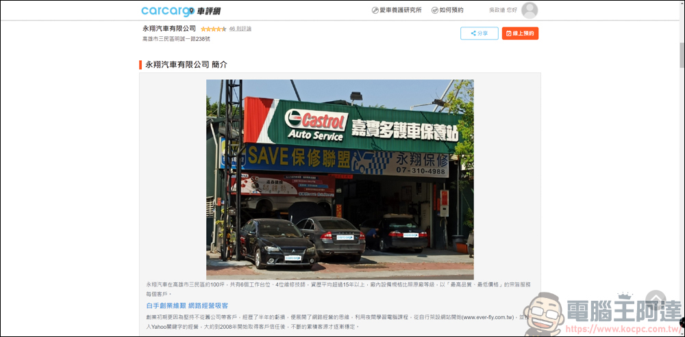 我們那天去高雄拍片時,剛好遇到車子胎壓不足的狀況,直接用 carcargo車評網搜尋後,就在附近找到這間保養廠,上面會有該保養廠的評價、營業時間、電話、地址: