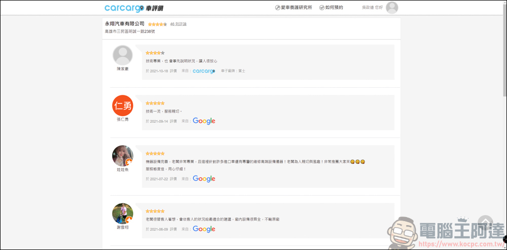 carcargo車評網有一點相當不錯的就是,網站內已串接 Google 評論,不需要再回到 Google 地圖一個一個的看,這邊都幫你整理得好好的,而除了 Google 評論以外,裏頭也會有 carcargo車評網會員所留下的評價,這樣消費者就能透過兩個不同平台的評價,去判斷說是不是洗出來的...: