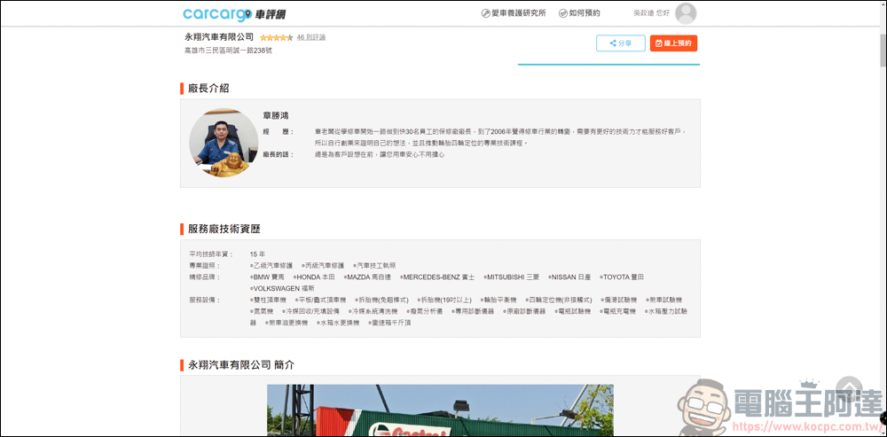頁面往下拉也可以看到廠長介紹、技術資歷、公司簡介...等,像這家永翔汽車,維修的設備和維修的品牌都在頁面上寫的清清楚楚,如果你真的不太懂車的話,建議要保養前可以先透過電話詢問: