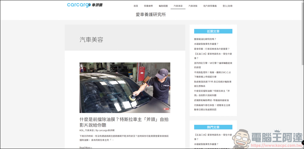 對於汽車保養、美容較不了解的消費者,carcargo車評網也有提供愛車養護研究所,在上面你就可以找到汽車保養、美容、改裝...等資料,建議如果是新車主的話一定要看一下,這邊的文章能讓你對新愛車又更深入的了解,讓你知道什麼時候該保養,遇到問題時應該怎麼解決,稍微了解一下比較好懂維修師傅在跟你說什麼,也減少被坑的機會。而且在上面也可以看到不少車評網的編輯前進到合作的店家進行採訪,透過文字、影片的方式,讓你更了解各保養廠的服務內容、設備,讓每位消費者在找保養廠之前,先行觀看做足功課:
