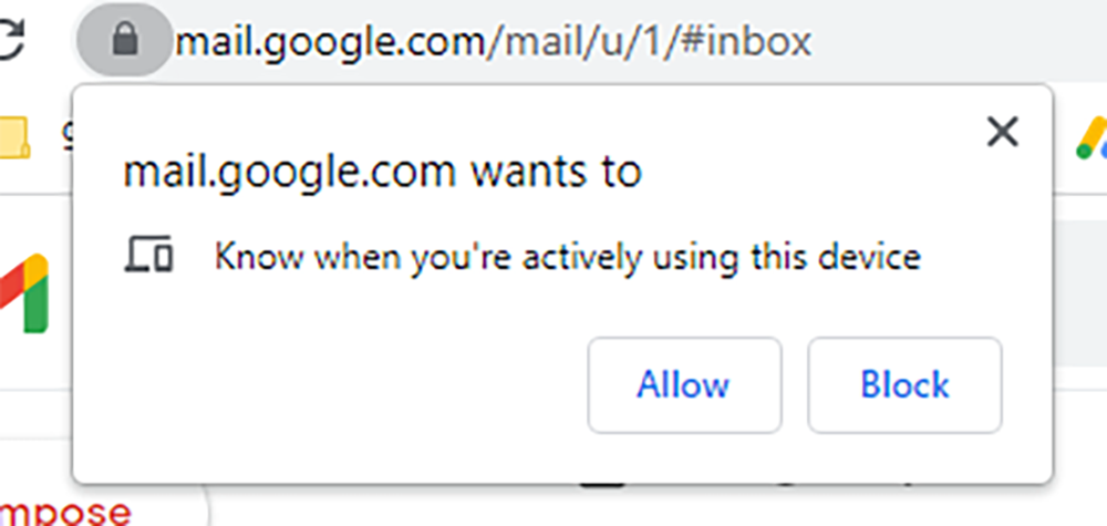 緊接著還會觸發瀏覽器權限,來詢問是否准許「know when you’re actively using this device」也就是會透過 Gmail 在瀏覽器中的狀態,去判斷你是否正在使用這台電腦設備。