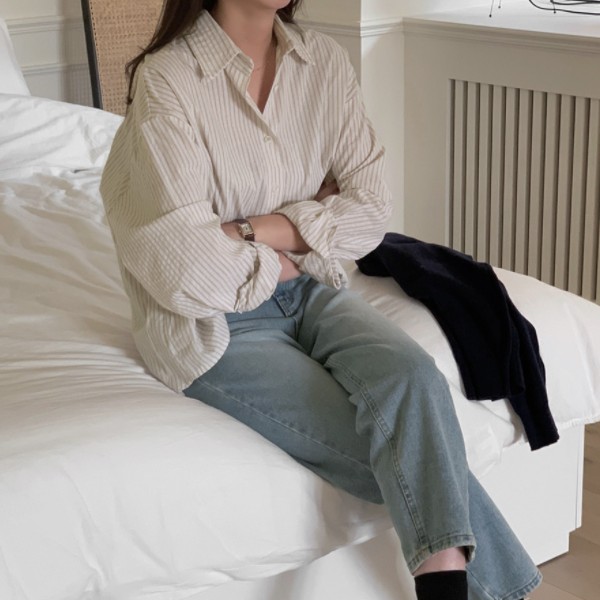 韓國空運 - 捲捲邊坑條長袖上衣
