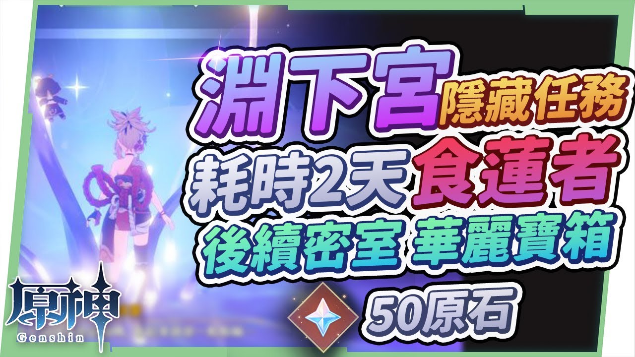 哈囉哈囉! 我是虛擬Youtuber璐洛洛,今天要帶來關於淵下宮解謎探索中,其中一個需要耗時現實兩天才能完成的世界任務《食蓮者》,而在這個任務過程中還會獲得一個密室的鑰匙,要獲得密室中的寶藏也需要稍微解個謎,解完即可獲得珍貴寶箱和華麗寶箱,洛洛會將任務流程以及密室的解謎方式濃縮整理在影片中,若是還有沒解的玩家們,可以跟著洛洛的懶人包來一起完成哦!那影片開始前,若你還沒有訂閱洛洛的頻道的話,記得先訂閱一下唷!