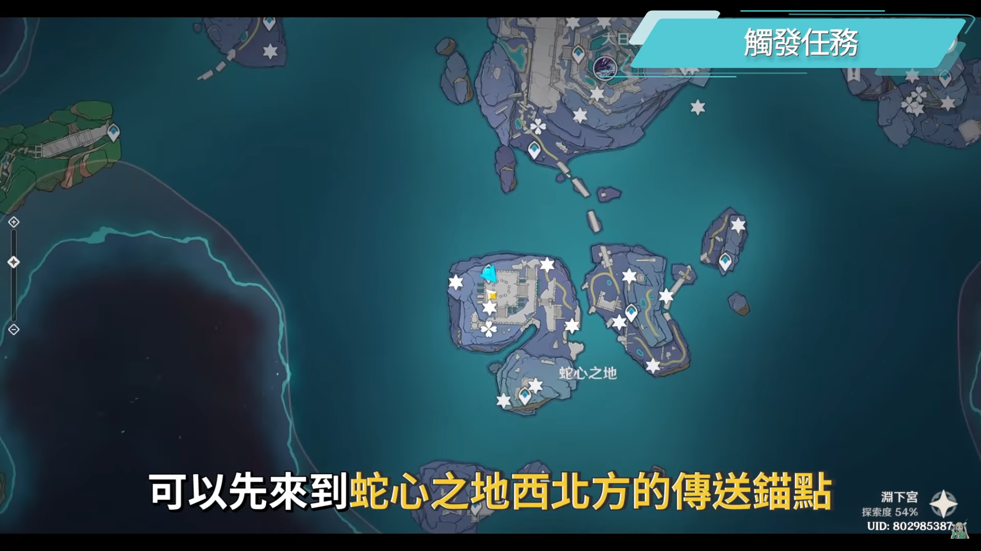 若是有解淵下宮的主線任務,把淵下宮的地圖錨點都打開後,可以先來到蛇心之地西北方的傳送錨點,記得要先調整日月迴輪到常夜模式,再往西邊懸崖跳下去,順著地下通道可以看到一個仙靈,看自己情況是不是要順路把它送回去。