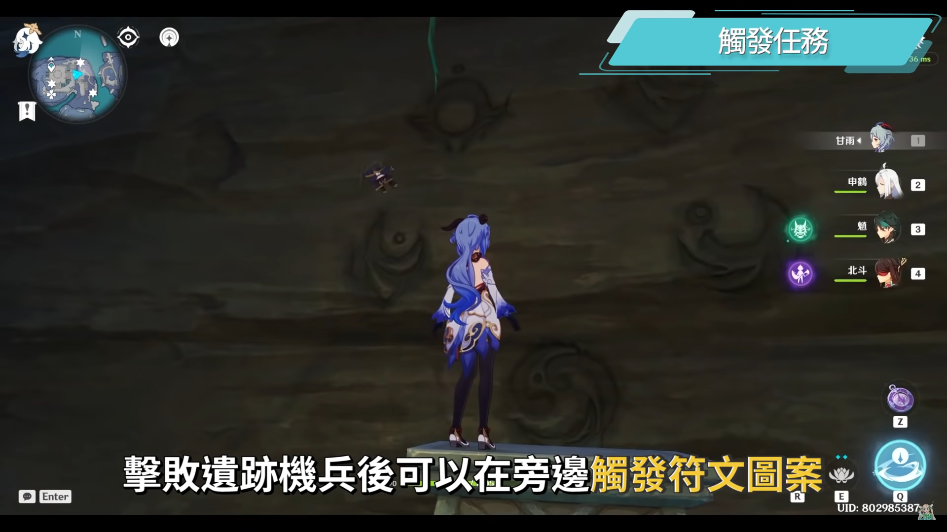 再往內深入會看到有一隻遺跡機兵駐守的地方和一個蒐集雷元素微粒的限時挑戰,旁邊也有漁點可以釣魚,擊敗遺跡機兵後可以在旁邊觸發符文圖案,可以先拍照截圖把順序記下來,再回到蛇心之地的祭壇按照剛剛記下的順序去觸碰旁邊的符文光幕,接著就會出現這次《食蓮者》的任務NPC殘影。