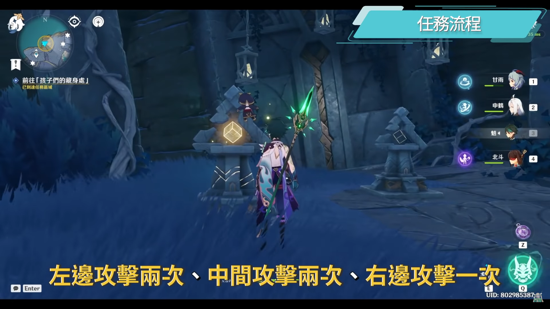 出現殘影後與其對話,從對話中可以了解到這個殘影身前是反抗軍,對話完後我們可以在祭壇附近找到關於他身分的石碑,再隨著任務指引來到孩子們的藏身之處,出發之前可以先去旁邊的日月迴輪調整到白夜模式,或是狹間之街的半山腰也有一個日月迴輪,來到目的地後可以用普攻攻擊旁邊的三角形機關,普攻解謎的順序為:左邊攻擊兩次、中間攻擊兩次、右邊攻擊一次,順序沒有關係,主要是三角形的攻擊次數總數要正確,若是正確的話會有訊息提示,接著入口的門就會打開。