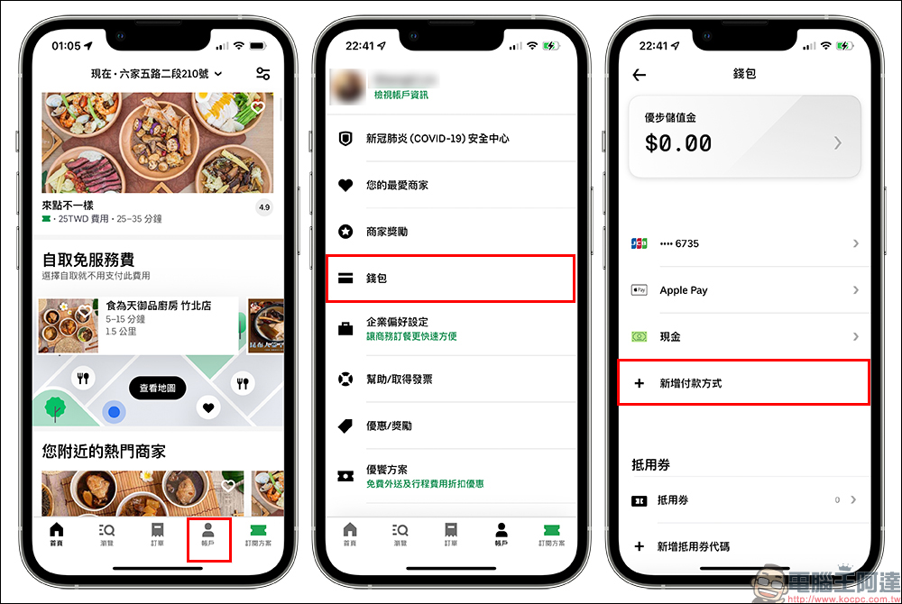 由於 LINE Pay 在去年初就暫時不能於 Uber Eats App 使用,或許很多這段時間加入的 Uber Eats 新用戶還不知道該如何新增 LINE Pay 這支付方式。其實只要開啟 Uber Eats App 點選主畫面底部的「帳戶」選單後,接著點選「錢包」就能查看各種支付方式。除了原有的信用卡、Apple Pay(限 iPhone)、現金,若要新增 LINE Pay 付款則點選「新增支付方式」按鈕。