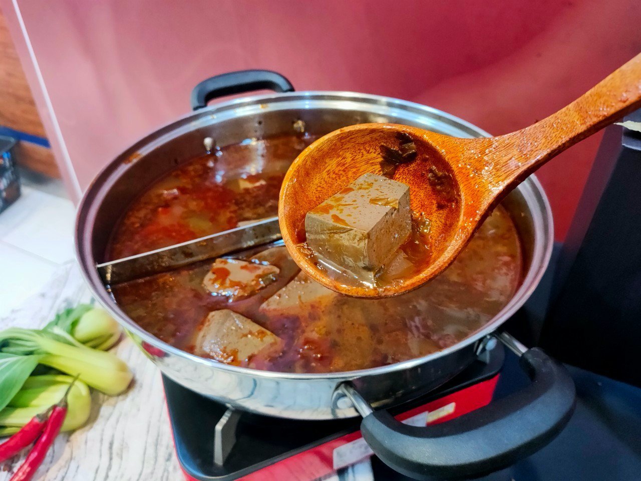 香港版的鴨血包中帶有一包寬粉絲,杜汶澤知道台灣人很喜歡吃火鍋,所以商品改到台灣賣後,就變成了鍋底的版本!不管是冬天冷冷的時候來煮一鍋麻辣鍋,還是半夜突然想來點重口味的宵夜都很適合。