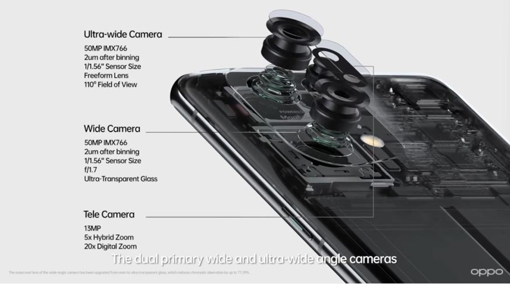 在相機部分,OPPO Find X5 Pro 搭載 5000 萬畫素廣角(F1.7)、5000 萬畫素超廣角鏡頭,以及 1300 畫素長焦鏡頭。其中在廣角與超廣角鏡頭上面皆搭載 IMX766 感光元件,並且在廣角鏡頭上還加入五軸 OIS 光學防手震系統,結合演算法讓每一次拍攝都能有像抵抗手震、降低噪點並且使影像更銳利。OPPO Find X5 Pro 還在專業模式 (Pro Mode) 內加入 Hasselblad 自然色彩校正功能以及一系列創意大師級濾鏡,為手機攝影帶來鮮明的自然色彩、專業色彩特性與風格。前鏡頭則採用定製款感光元件 IMX709,並導入 MariSilicon X 處理器讓自拍畫質更勝以往,即使在不完美的光源條件下也能拍出亮眼作品。在自拍模式下,鏡頭還能自動從 80 度切換為 90 度超廣角有利捕捉團體精彩合照。