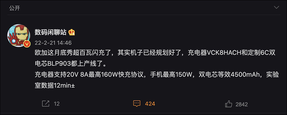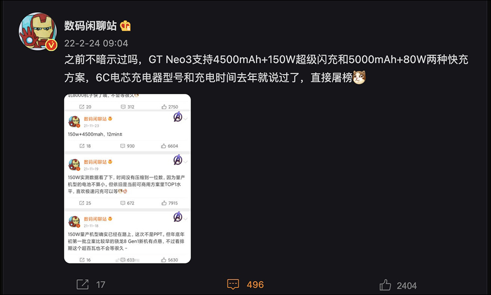 不過 realme GT Neo3 的電池容量和快充並非僅有單一種版本,預計推出兩種快充方案,分別為「等效 4,500mAh 容量電池+ 150W 超級快充」和「等效 5,000mAh 大容量電池+80W 快充」這兩種快充方案,其中搭載 150W 超級快充的方案將搭配 160W 的快速充電器,能為 realme GT Neo3 提供最高 150W 的快速充電,根據實驗室的數據只需 12 分鐘就能充滿電。上述兩款電池配置皆採用雙電芯設計,也才能進一步提升充電的效率。