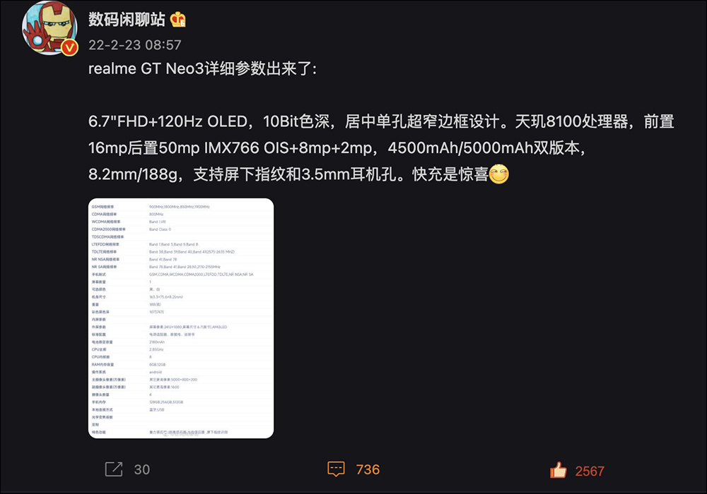realme GT Neo3 外觀、規格提前洩露:搭載天璣 8100 處理器、傳將全球首發支援最高 150W 快充