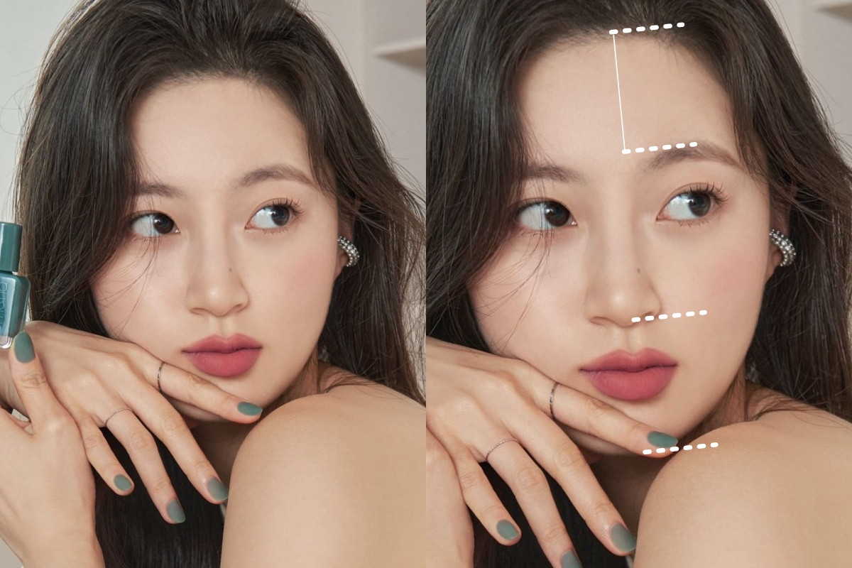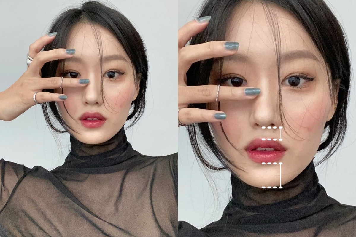 人中其實是面部下庭的重點,以嘴唇下緣到下巴末端的整個「下巴長度」為基準,如果人中長剛好等於下巴長度1/2是比較完美的比例,人中稍微小於下巴長度1/2的話、代表你的下庭偏長,可以稍微在眉毛下緣往下延伸、將眉毛畫的粗一點,臉型比例更平均。
