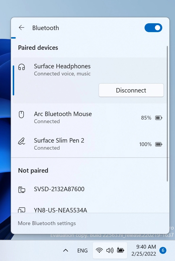 接下來,在 Windows 11 build 22563 裡面將會使整個連接藍牙裝置的方式更快速且直覺。在接下來將會讓用戶以類似於連接 WiFi 的方式顯示附近的藍牙設備清單,你可以直接查看並且直接從中選擇想要連接與中斷連接的項目,不必再多此一舉繞過去設定裡面處理。