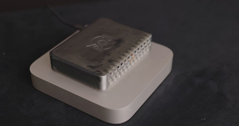 外殼部分,Nelson 以 3D 列印為 Mac Mini 製作一個更小的機殼,採用 2019 年 Mac Pro 具乳酪刨絲器特色的設計以增強散熱效果;天線和電源按鈕等零件重新配置到新的外殼裡面,並且拆卸下 Mac Mini 的風扇,整體而言,改造過後的設備內部容量是原始容量的 28%,整個機身體積比 Mac Mini 縮小了 78%。