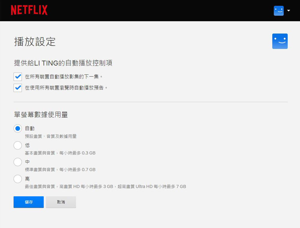 - 在這裡總共提供四種畫質選項讓你依照個人使用情況來選擇,品質越低消耗的數據就越少,反之亦然。選好之後別忘了按「儲存」。