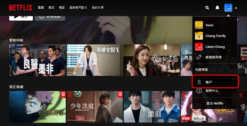 - 以瀏覽器開啟 Netflix 並登入後,滑鼠懸停在右上角個人頭像旁的向下箭頭,點選「帳戶」。
