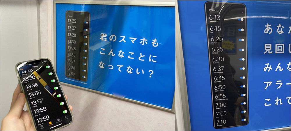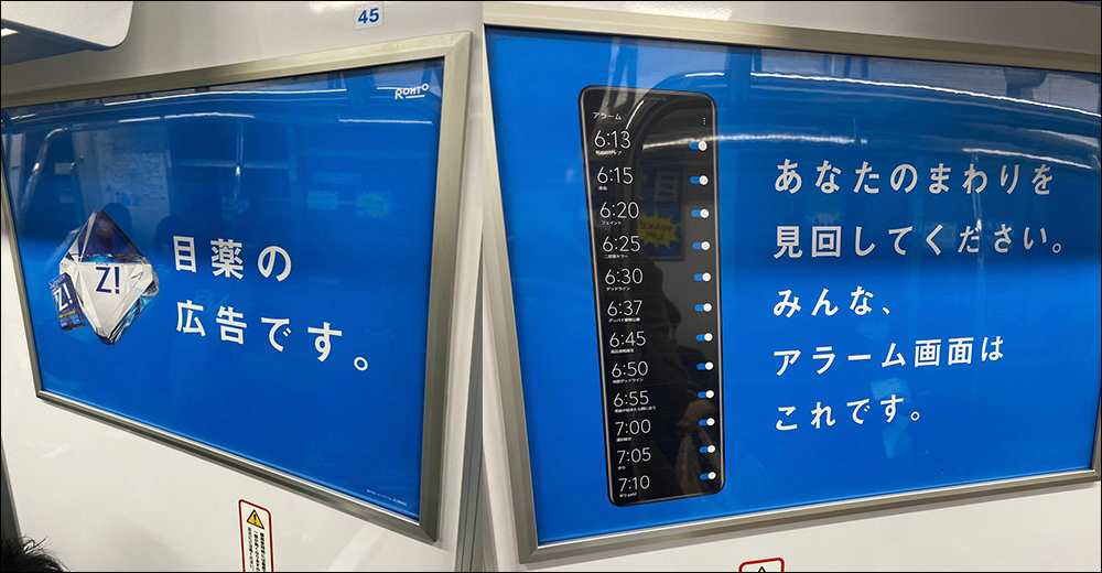 最近日本樂敦製藥在當地電車的車廂推出新廣告,就在車廂內牆上各個廣告欄位放滿了超長的手機鬧鐘畫面,以許多民眾每天都設定超多鬧鐘叫醒自己的方式,進而呼應著若使用這款眼藥水就如同設定超多鬧鐘般「絕對清醒」。