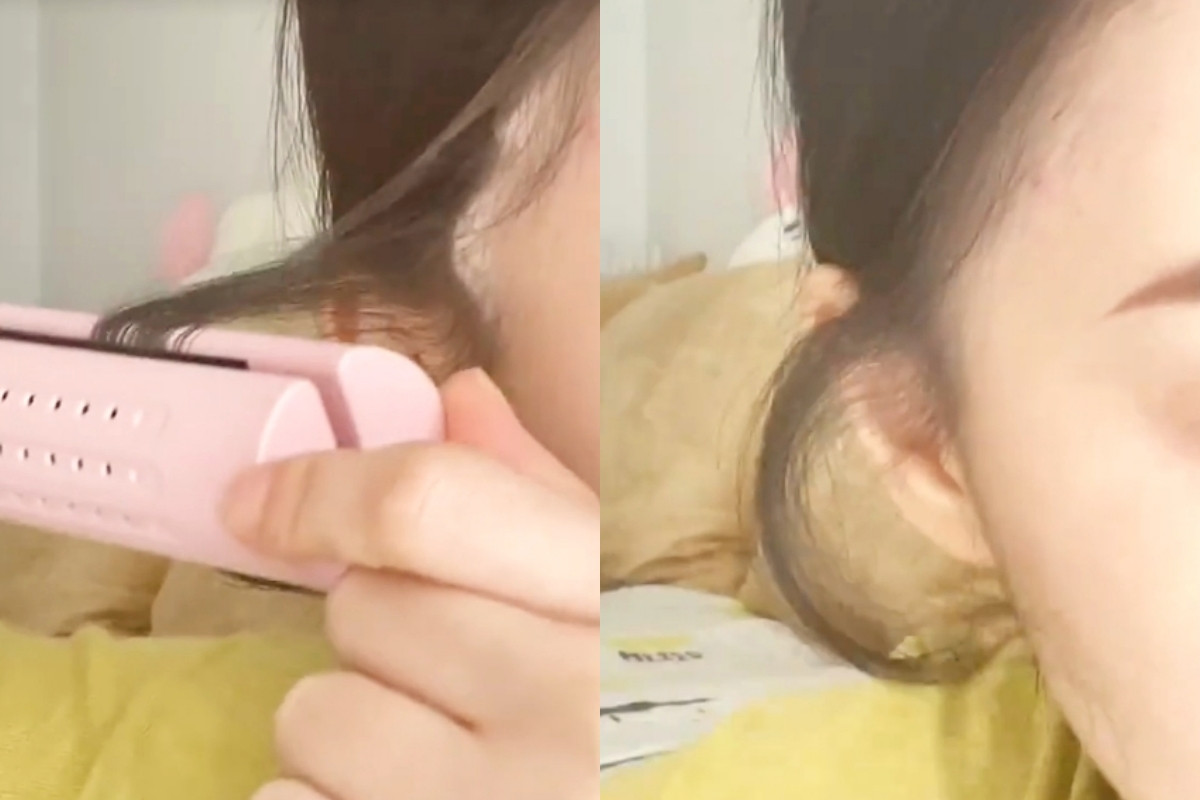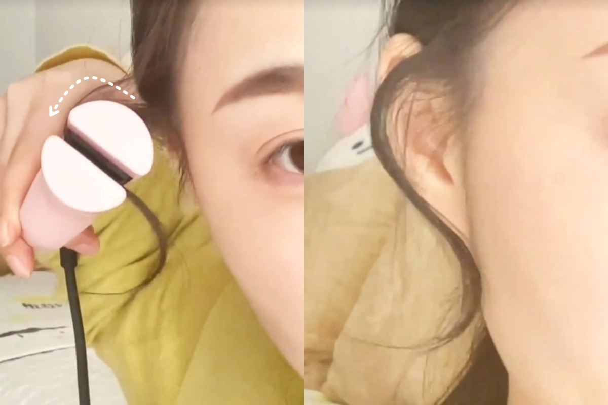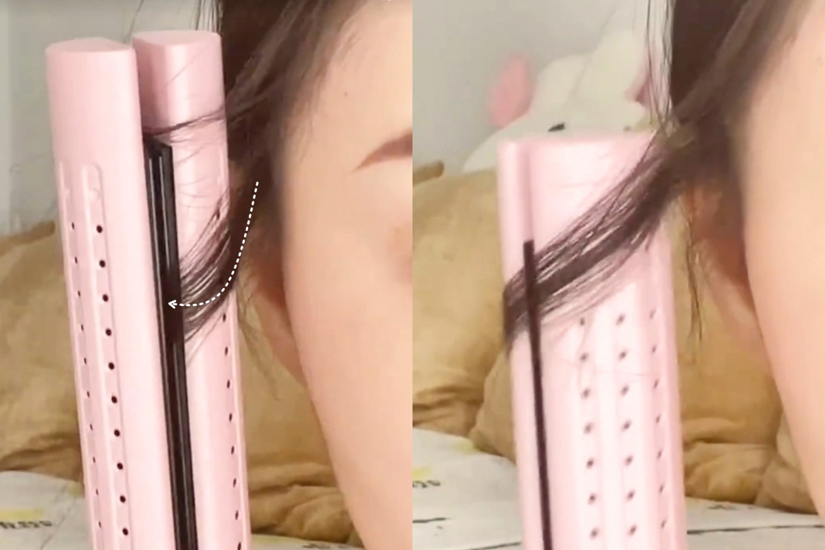 這款S型碎髮有點像是三管電棒的捲度,更加俏皮活潑,也很適合與捲髮做搭配,首先一樣先用平板夾、離子夾夾住鬢角髮尾部分,接著往上拉、讓髮尾有一個往上翹的弧度。