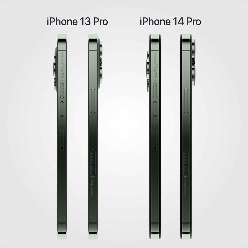 另一位設計師 @ld_vova 之前也製作了「松嶺青色」的 iPhone 13 Pro 和 iPhone 14 Pro 機身側面渲染圖比較,但相較前面 @apple_lab 的作品,這個版本則是仍維持相當有「體積」的主鏡頭。