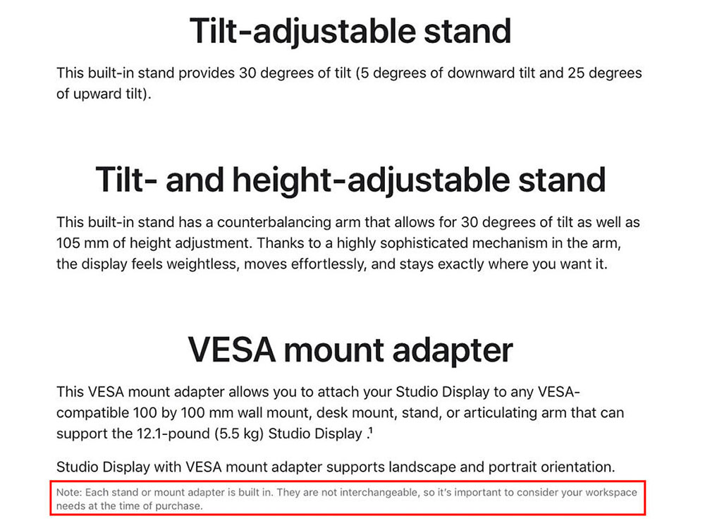 Apple Studio Display 在官網上提供三種可供選擇配備的支架形式,包含可調整斜度的支架、可調整斜度與高度的支架以及一個 VESA 吊架連接器,售價從新台幣 45,900 元起,然而,很多人不知道的是,在你下單時選擇的支架將會是永久性的。