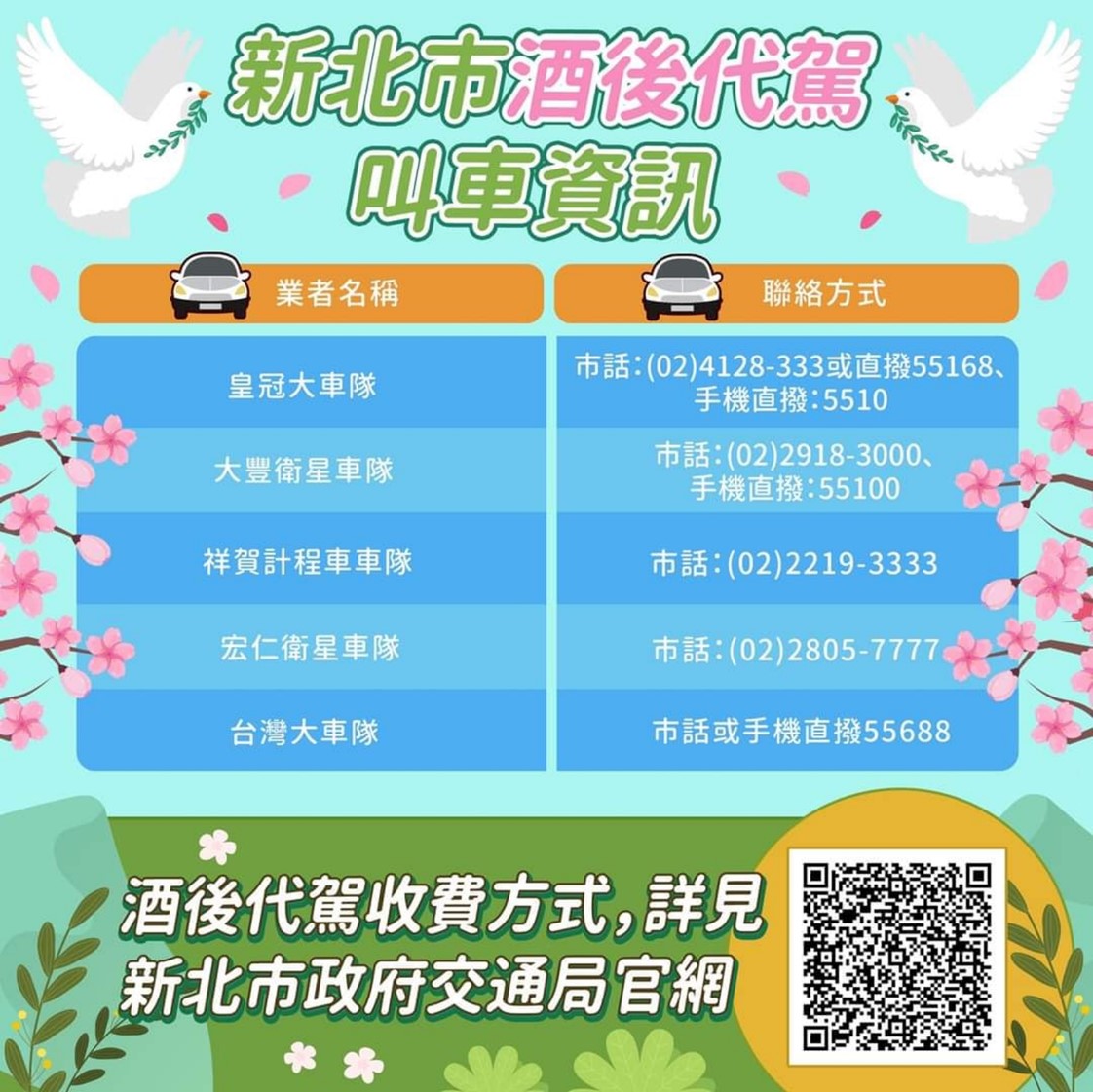 新北市政府酒後代駕業者與預約叫車服務方式如下: