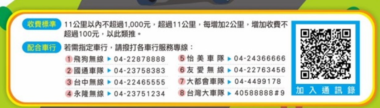 台中市提供的酒後代駕叫車專線為市內電話(04)2222-1999(免付費專線)。台中市酒後代駕合作業者預約叫車專線與收費標準如下: