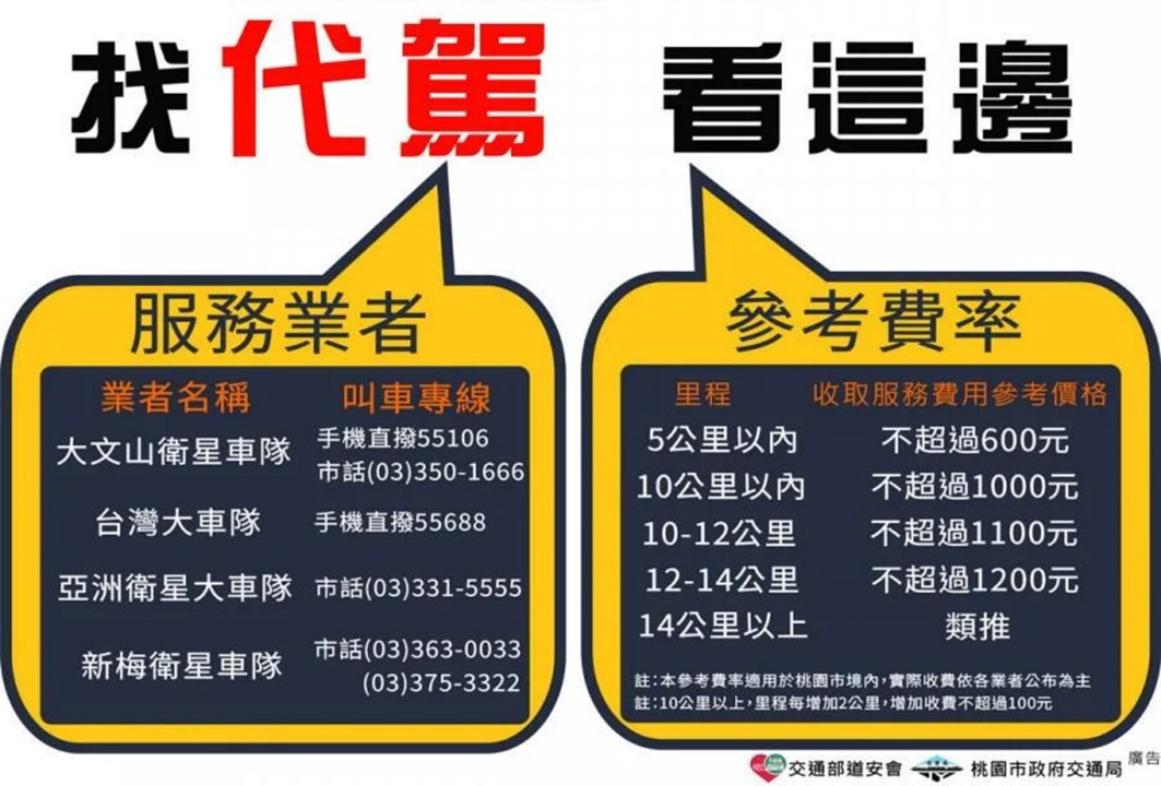 桃園市市政府酒後代駕合作業者有四家,各業者預約叫車專線與收費上限如下: