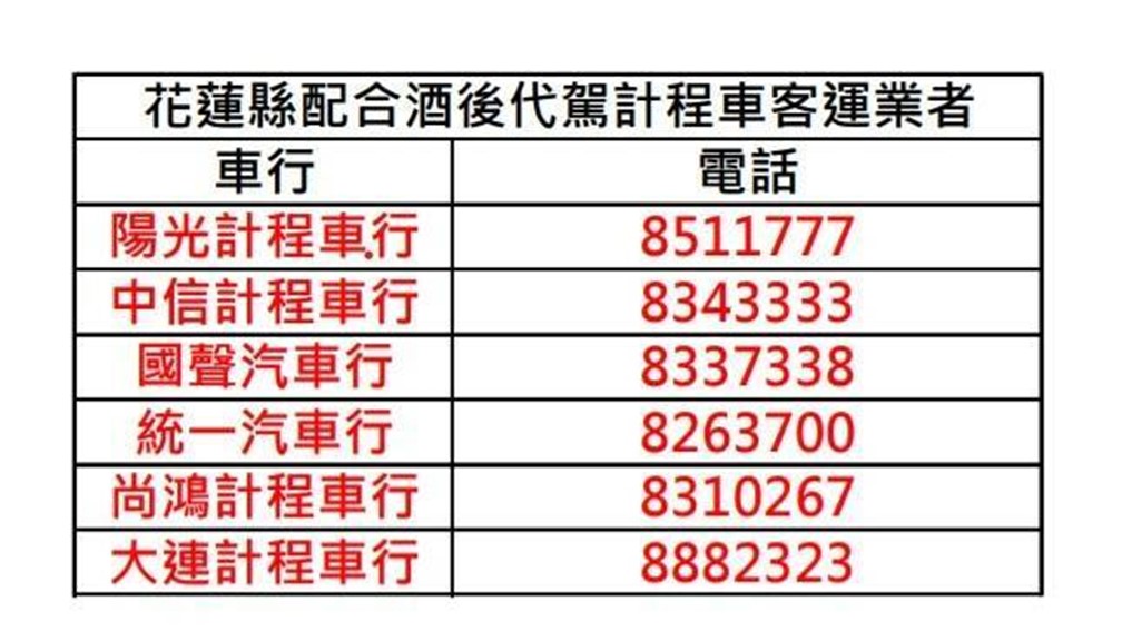 花蓮縣內配合酒後代駕計程車業者有陽光、中信、國聲、統一、尚鴻、大連等6家車行,各業者收費規則,依時段及起步價略有不同,但原則上10公里以內,不超過1000元,每增加2公里,加收費用不超過100元。
