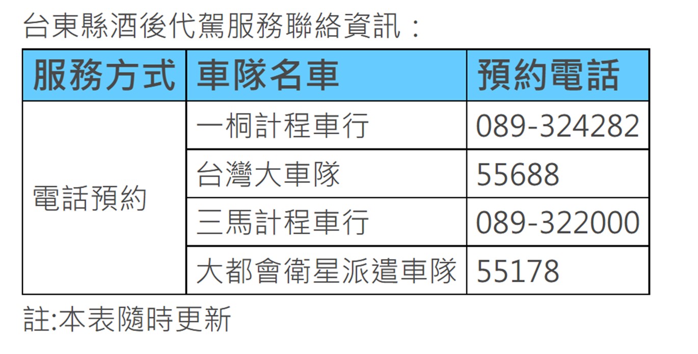 屏東縣提供酒後代駕之業者預約叫車專線如下:
