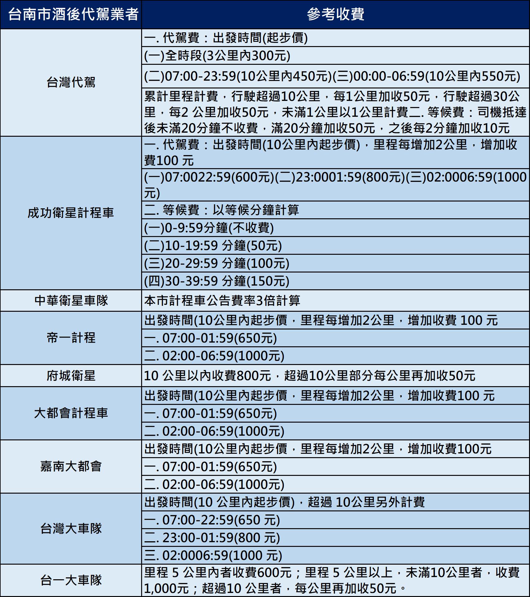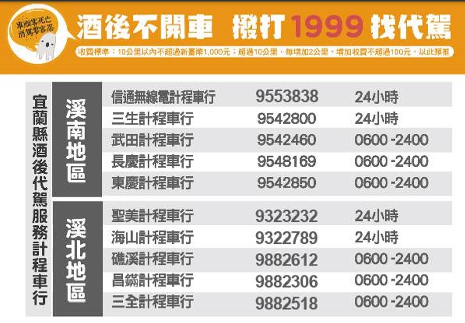 以下是各縣市推出的「酒後代駕服務」合作業者的叫車專線與收費標準: