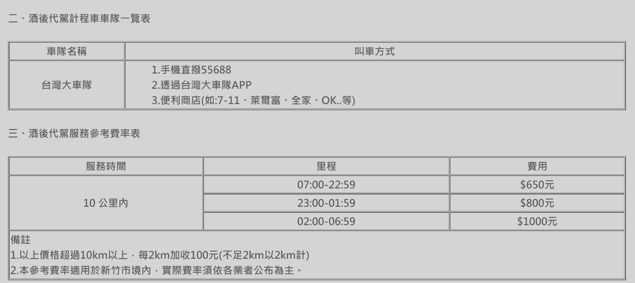 新竹市與新竹縣酒後代駕合作業者都是台灣大車隊,預約叫車專線與收費標準如下: