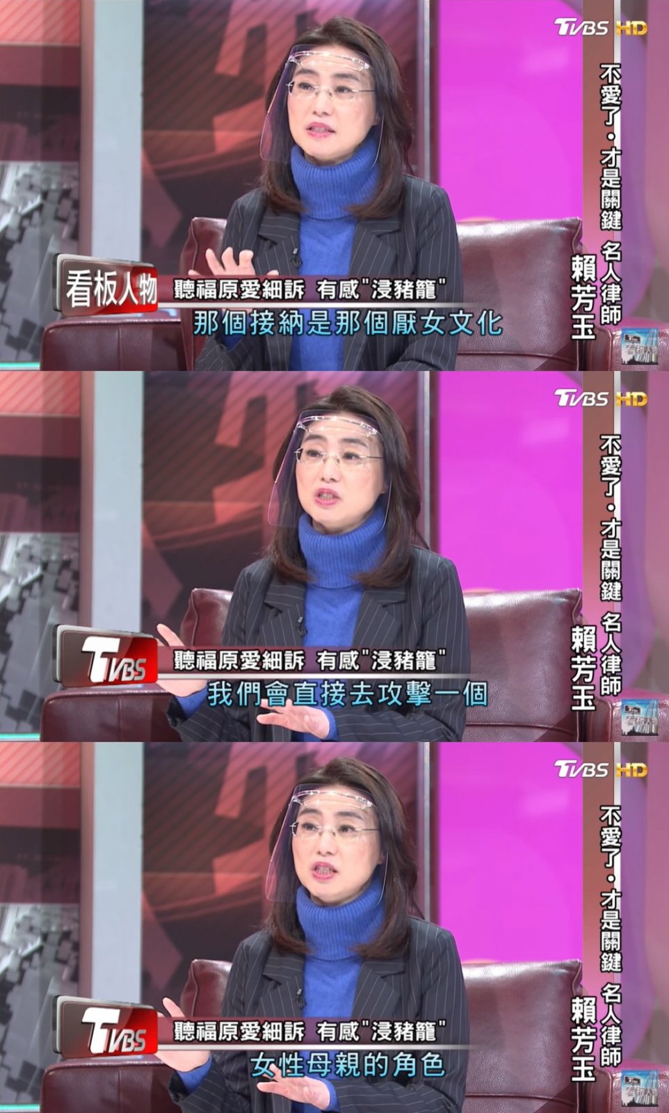 當賴律師意識到「厭女文化」正在發酵時,決定接下案件,她說當類似事件發生時,女性第一個被譴責的一定是母親的角色,但女性背後面臨的困境卻可能被忽略,在福原愛求助的背後,其實隱藏了是這個社會不利於女性的氛圍。