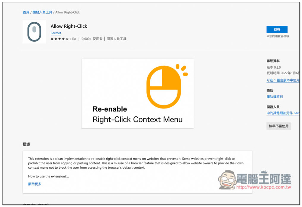 這裡我以 Microsoft Edge 為介紹範例,操作上都差不多。進到擴充功能商店頁面後,就按右側的取得進行安裝: