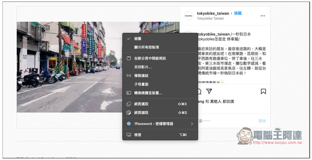開發者介紹頁面有提到,這工具除了能解除右鍵功能鎖定,還可以下載 Instagram 圖片與影片、TikTok 影片以及 500px 圖片,不過不知道是暫時壞掉還是怎樣,我測試 Instagram 與 500px 的圖片都失敗,沒有出現另存圖片的選項,但 Instagram 與 TikTok 影片就成功,解鎖右鍵後會看到另存影片的選項。Instagram 與 500px 圖片我也確定這工具確實可以下載,我看其他人分享有出現另存圖片,所以有可能是暫時不能用: