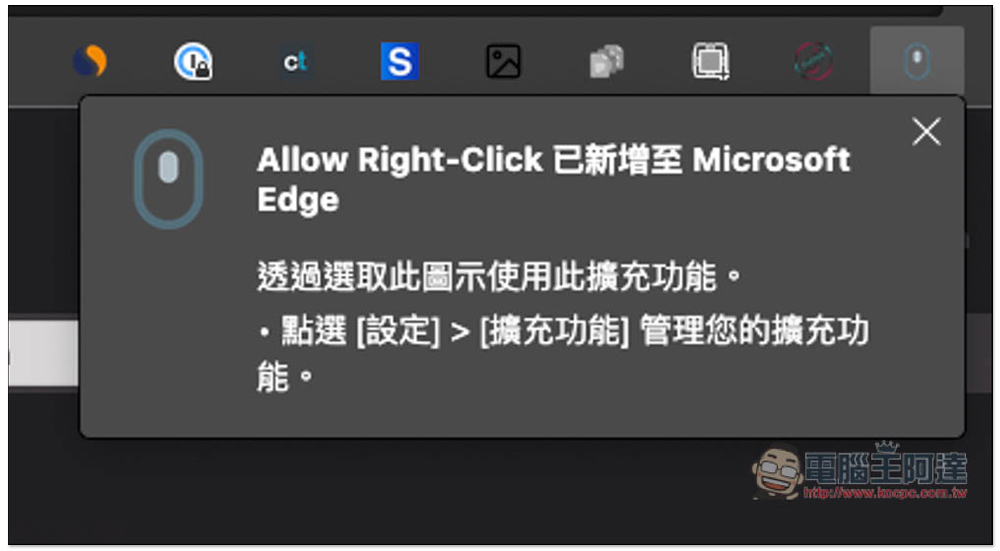 右上角顯示滑鼠的小圖示就代表安裝完成,如果沒有出現在右上角,需進到擴充功能管理介面把它釘選起來: