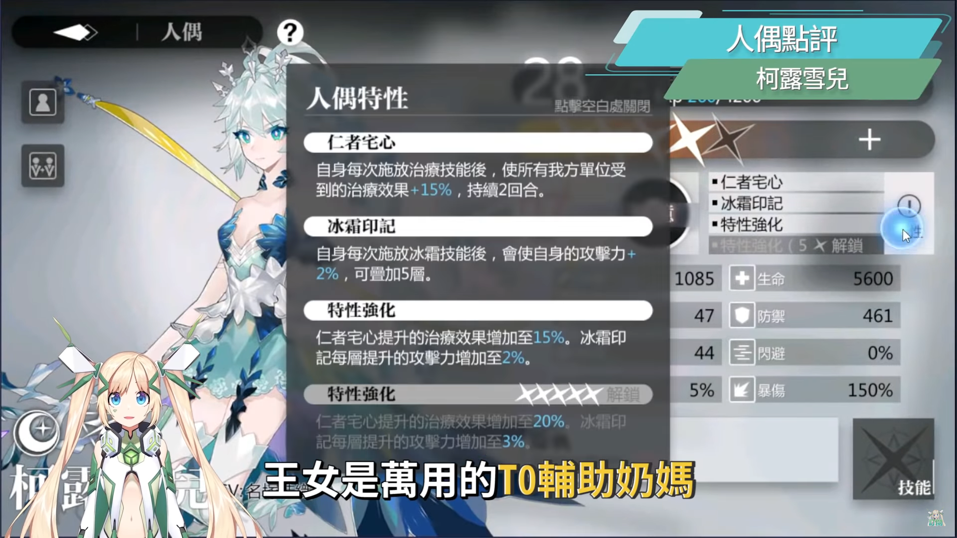 王女是萬用的T0輔助奶媽,人偶特性仁者宅心,增加的全隊治療效果提升讓王女擁有非常優秀的補量。冰霜印記讓柯露雪兒的冰霜模組在疊加效果後有非常高的攻擊力。