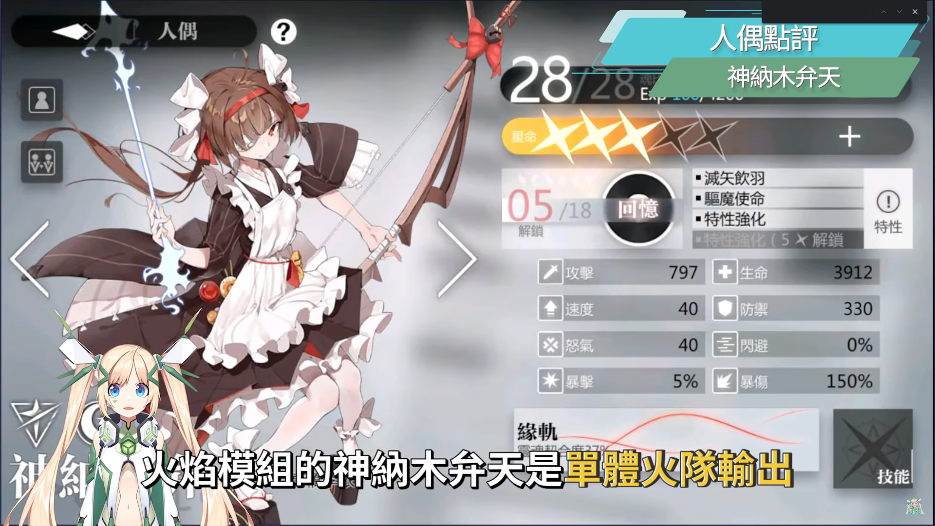 火焰模組的神納木弁天是單體火隊輸出,雖然輸出能力不太出色,但用來破盾速度非常快,奧義技能天羽聖裁可以對單體快速疊加燃燒效果,搭配秘術除靈追魂箭可以打出可觀的單體爆發。